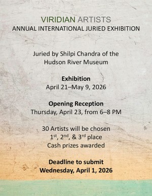 Deadline : Apr 01, 2026 Awards: Cash prizes for 1st, 2nd, and 3rd placeViridian Artists Gallery is proud to present its 34th International Juried Exhibition, juried by Shilpi Chandra, Assistant Curator at the Hudson River Museum.