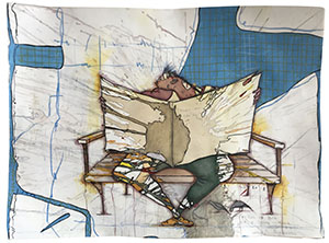 Watercolor, gouache, acrylic, India ink, ballpoint, graphite, color pencils, coffee on paper.